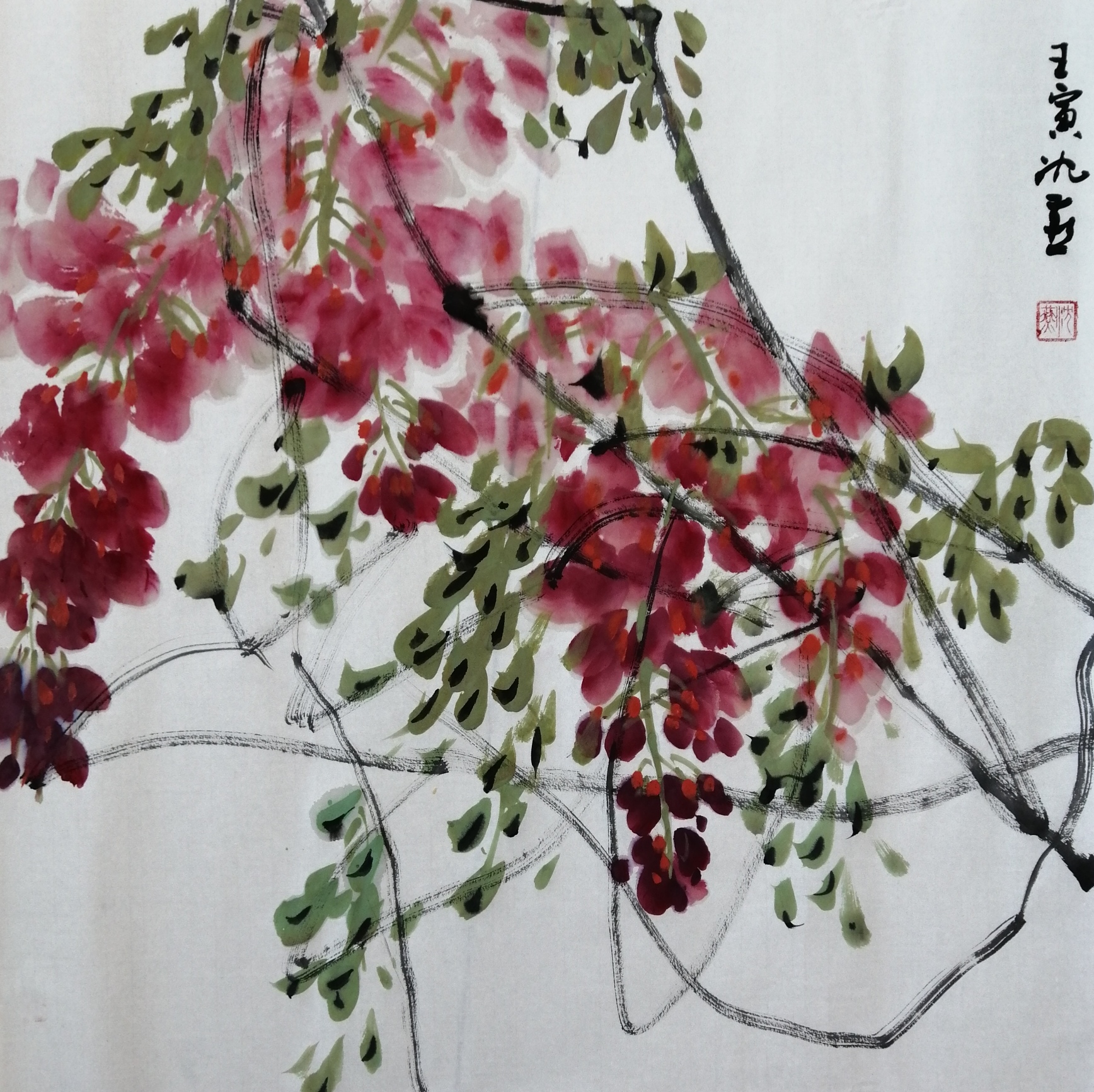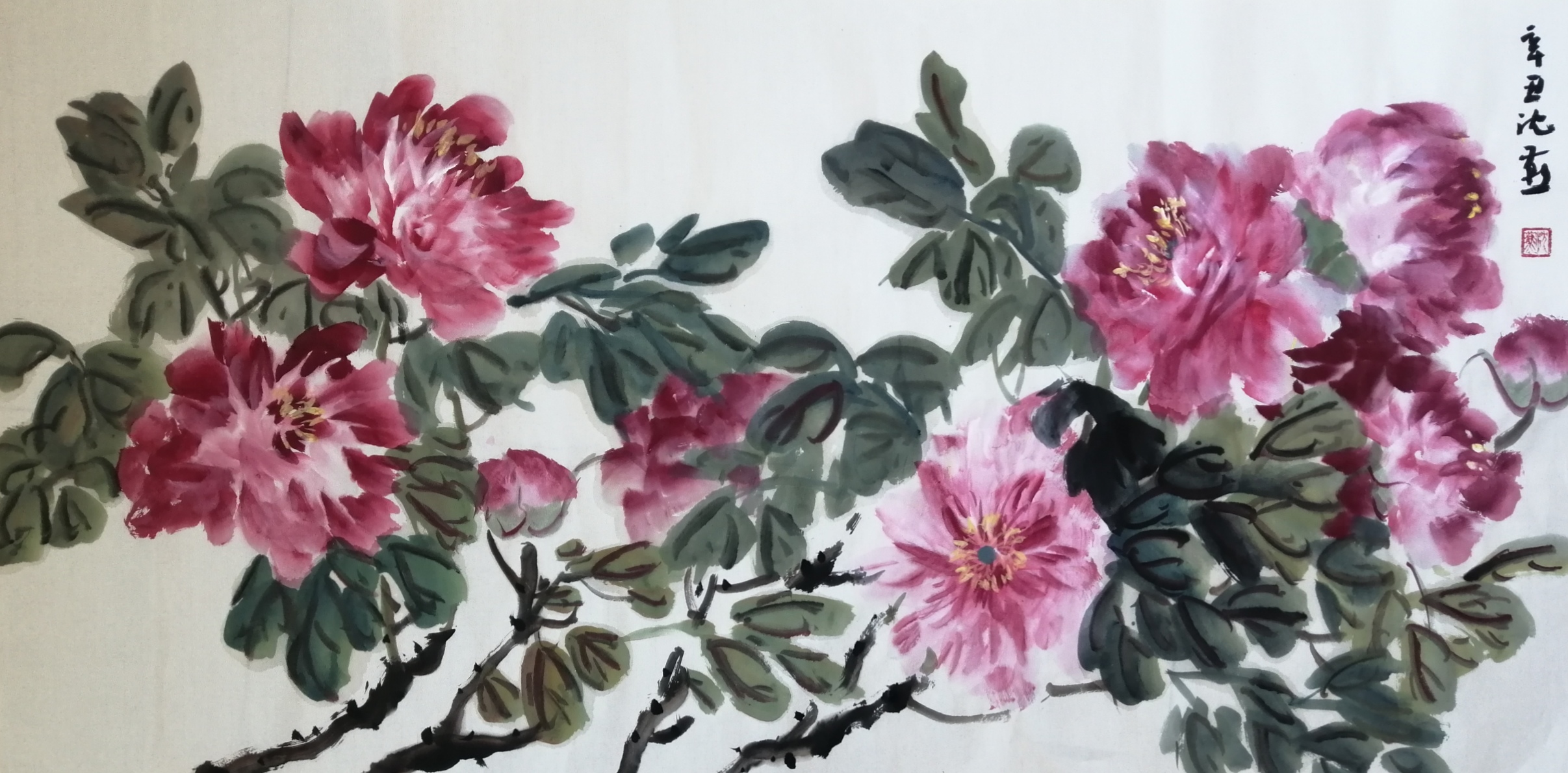 在构图上,画面以斜线和曲线为主,形成了动感的视觉流动,使整幅画面既有节奏感,又不失和谐。牡丹的摆放和分布经过精心设计,呈现出自然生长的姿态,同时也显示了画家沈燕对自然美的深刻理解和表现。2023-12-26 -