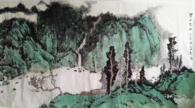 这幅画名为“犀照牛渚”,以传统国画的技法细腻地描绘了和谐宁静的乡村牧场景象,体现了东方艺术的精神内涵和审美情趣。